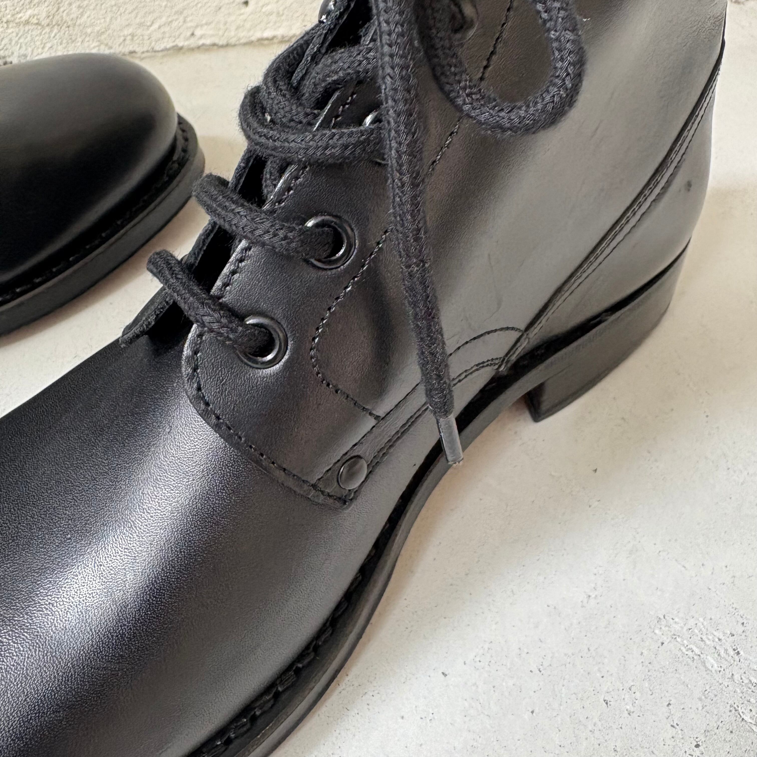 シンプルなプレーントゥ、アッパーと同色のシューレス部のアイレット、レースアップされた無骨なブーツらしいフォルムの6ホールのハイカットデザイン。